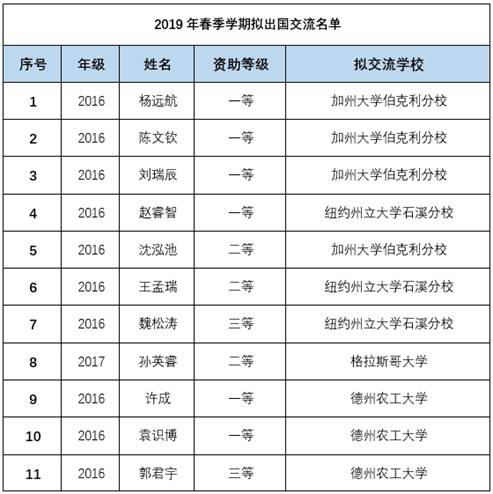 2018年10月11日,理学院物理试验班举行了2019年春季学期学生出国交流选拔面试,综合学生的学分成绩及面试表现,同时参考学生的交流意向,最终确定了同意推荐申请的11位学生名单及交流学校,现将名单予以公示。