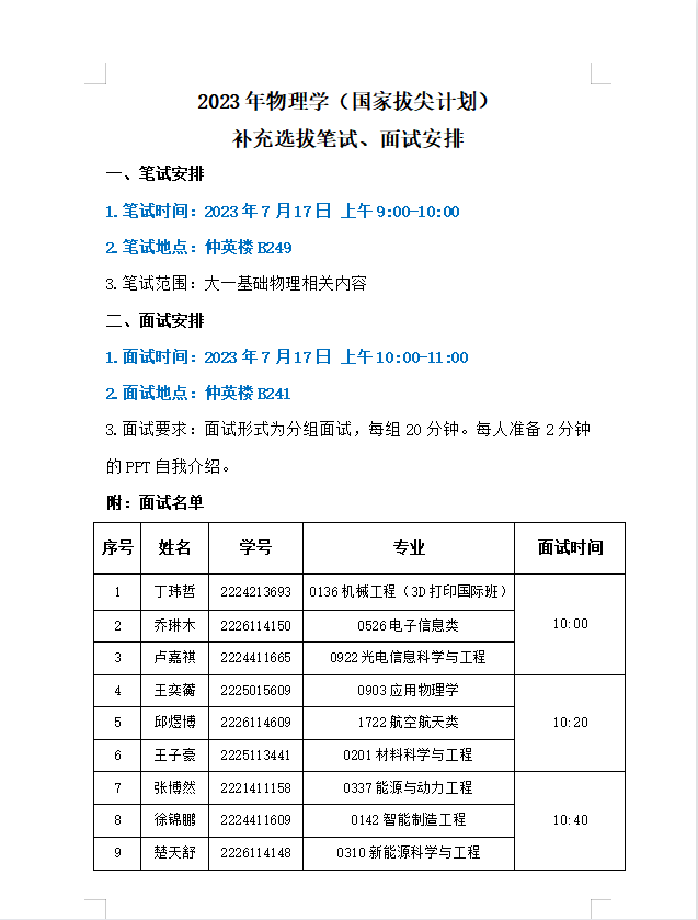 2023年物理学(国家拔尖计划)补充选拔笔试、面试安排