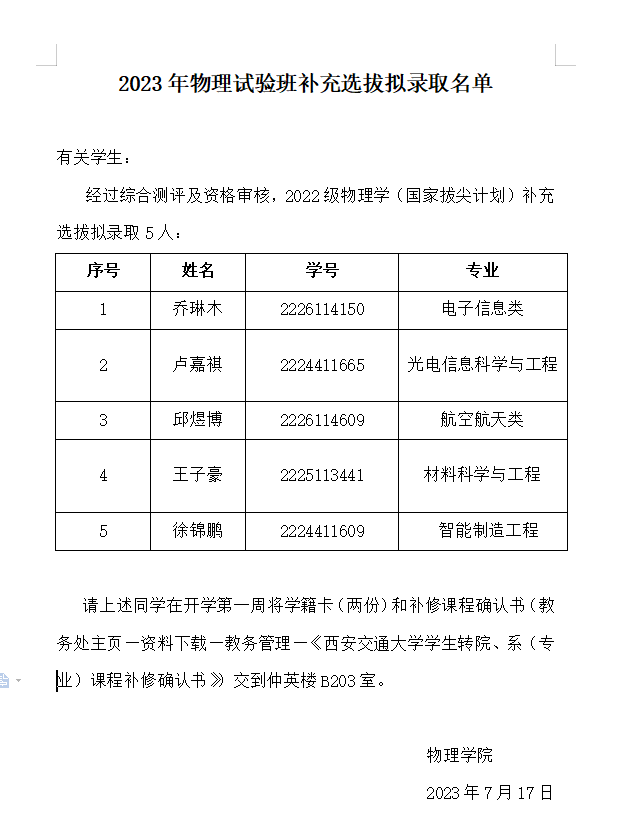 2023年物理试验班补充选拔拟录取名单