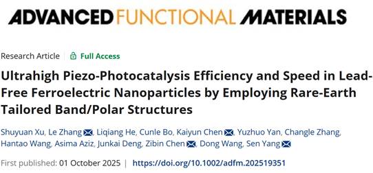 上述研究成果近期以《Ultrahigh Piezo-Photocatalysis Efficiency and Speed in Lead-Free Ferroelectric Nanoparticles by Employing Rare-Earth Tailored Band/Polar Structures》为题,发表于国际权威期刊《Advanced Functional Materials》。伊莉影片