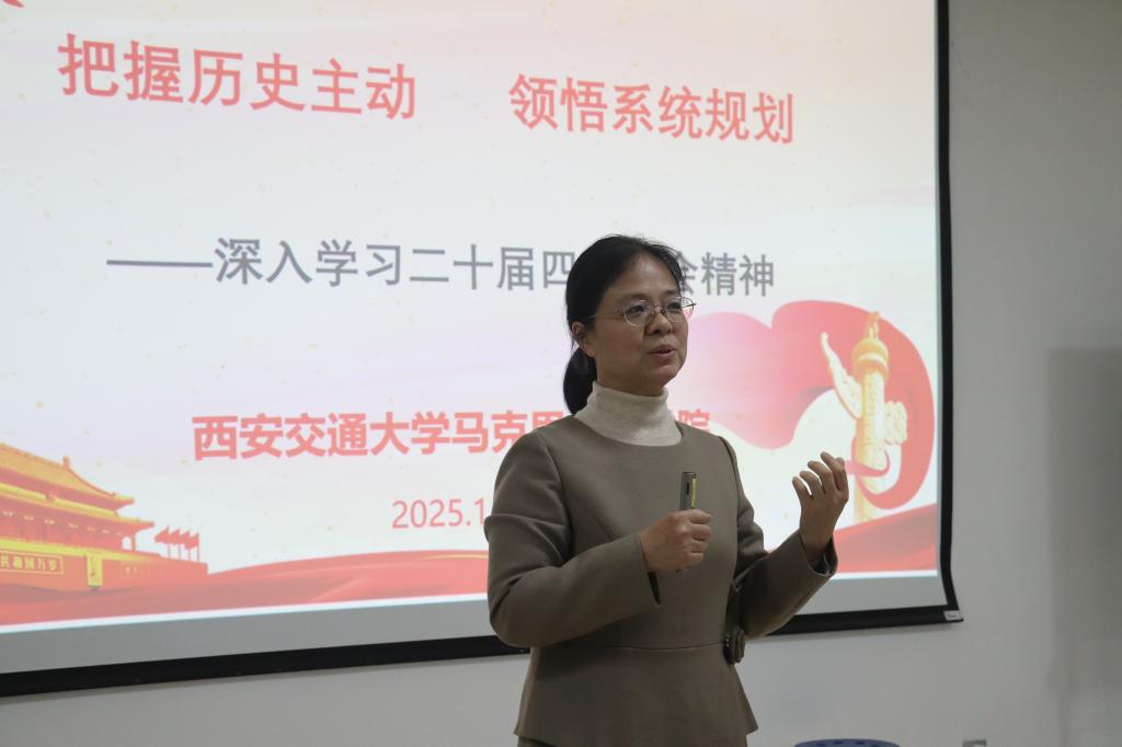 15日下午,马克思主义学院陆淑敏副教授以“把握历史主动,领悟系统规划”为主题解读二十届四中全会,从时代背景、核心要义到重点部署进行系统讲解,阐明全会在推进国家治理现代化、落实高校立德树人任务中的重要意义,帮助同学们深化对全会精神的理解。