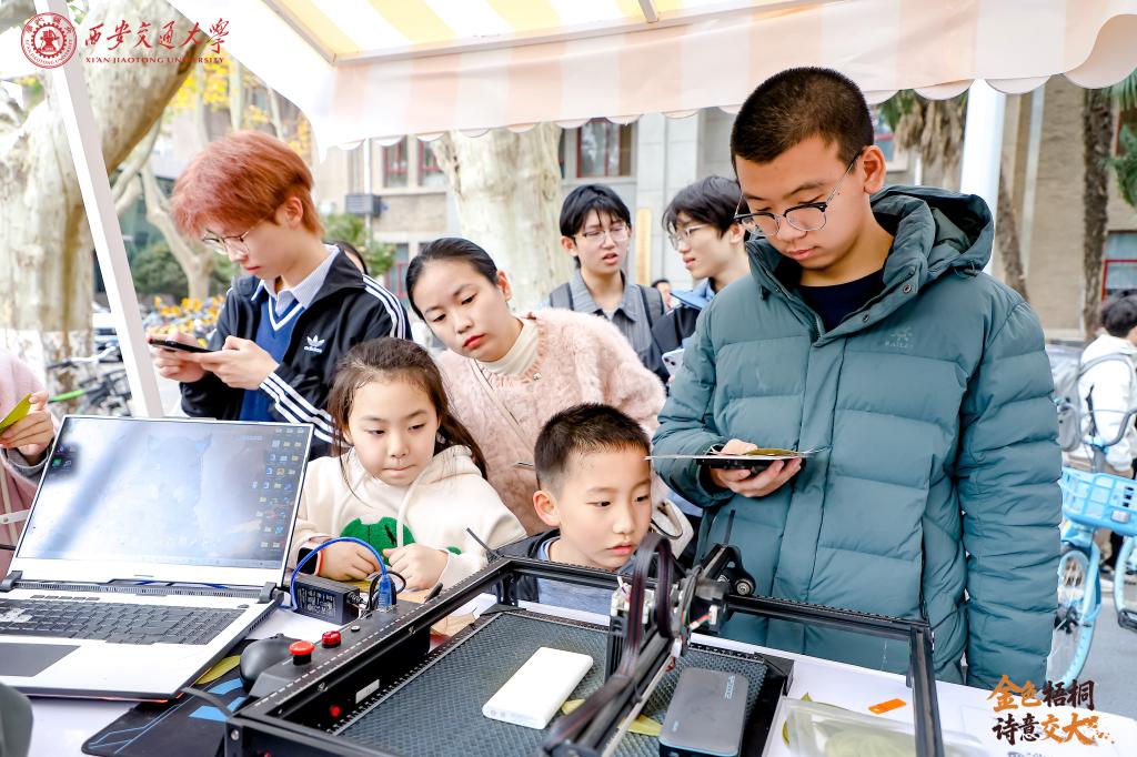 的志愿者们化身科普使者,现场操作激光打标机,为师生们定制专属落叶纪念品。一片普通的梧桐叶,在激光的“雕琢”下,不仅能呈现出师生们喜爱的照片图案,还能精准雕刻上校徽与校训,让每一片落叶都成为独一无二的“交大记忆”。在雕刻过程中,志愿者们耐心讲解激光原理,从光的直线传播到能量的集中释放,用通俗易懂的语言将抽象的物理知识转化为生动的现场演示,吸引了众多师生驻足观看、积极提问,在轻松愉悦的氛围中传播了科学知识。