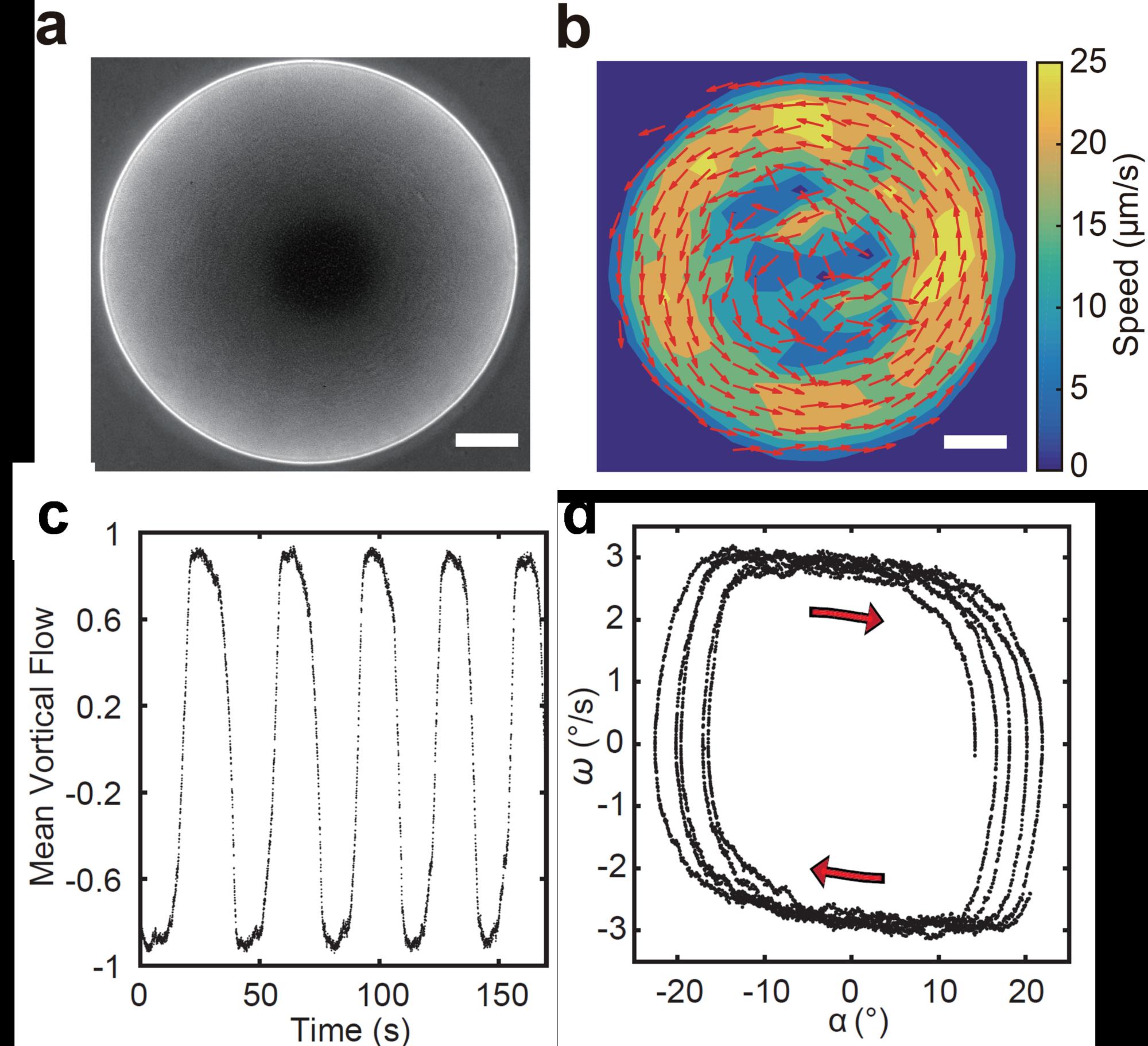 图: (a) 细菌活性流体形成的毫米尺度巨型涡旋(相差显微照片)。(b) 一个巨型涡旋的瞬时速度场。图a,b的标尺为250微米。(c) 巨型涡旋周期性地反转旋转方向(即扭摆式振动)。图中平均涡流(mean vortical flow)取正值时为逆时针方向,取负值时为顺时针方向。(d) 巨型涡旋周期性振动过程中角速度ω和转角α的相空间轨迹。