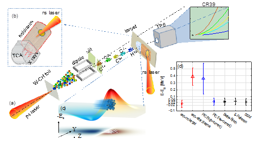 图2、(a)实验装置示意图;(b)ns激光轰击金腔驱动X射线加热TCA泡沫产生稠密等离子体;(c)强流准单能质子束在等离子体中激发纵向电场,质子束位于减速场中; (d)实验观测到质子束的能损比常用的两体碰撞理论预期(Bethe-Bloch, Li-Petrasso, SSM)高一个量级。