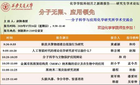 2020年7月26日上午,化学学院科创月之新港报告—“分子无限,应用领先”研究生学术交流会在创新港泓润楼2105会议室成功举办。该活动旨在促进学院研究所各平台间的相互了解,为今后的合作和交流奠定基础;同时也为学院进一步提高和锻炼研究生的表达能力,并拓宽其学术视野等提供帮助。和玲教授、赵翔教授、孟令杰教授及研究所其他师生共同参加了此次学术交流活动。