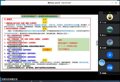 参会的老师们还交流了本学期开展线上教学的经验和建议,学习了申报《大学化学》线下精品课程的任务要求,明确了需要准备的材料和申报工作的重点和难点。会议议题丰富,讨论热烈,对于保证当前情况下大面积基础课程的良好教学效果、确保学生返校后教学活动的顺利进行起到了积极的推动作用,也为进一步建设精品课程明确了努力方向。