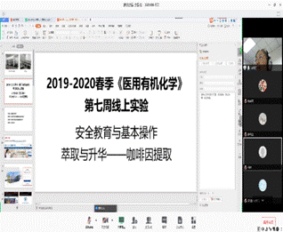 基于我校思源学堂平台和陕西省化学虚拟仿真实验教学中心平台以及中国慕课网等的丰富教学资源,化学实验教学中心根据《医用有机化学实验》课程特点,设计采用第三方直播平台(腾讯会议、雨课堂、钉钉等)+虚拟仿真化学实验项目+实验测试题+家庭实践活动+实验报告等综合性、立体化在线实验教学手段的线上教学方案。首次课程内容为安全教育、基本操作、虚拟实验教学项目(天然产物中有效成分的分离分析虚拟仿真实验,该项目是我中心已被评定为省级虚拟仿真实验教学项目)。