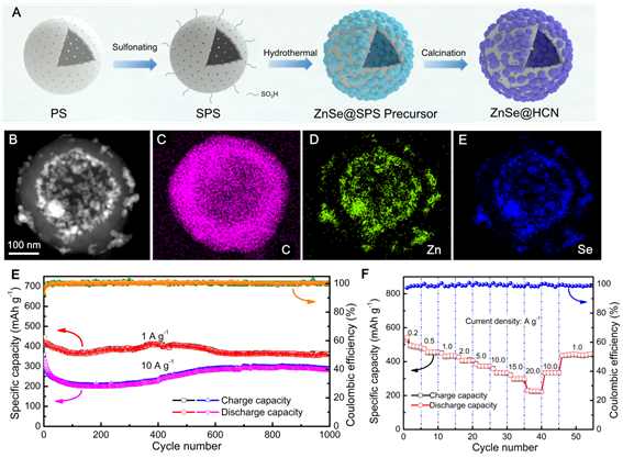 丁书江教授、高国新副教授团队和剑桥大学郗凯博士在国际能源重要期刊Nano Energy(影响因子13.120)上发表了题为 “Construction of ultrafine ZnSe nanoparticles on/in amorphous carbon hollow nanospheres with high-power-density sodium storage”的论文,第一作者为理学院芦世瑶硕士生,通讯作者为高国新老师和郗凯博士,西安交大为论文第一通讯单位。该工作借助乙二胺对离子在介孔通道的辅助渗透作用将超细ZnSe纳米颗粒均匀生长在无定型空心碳纳米球的壳层内表面和外表面(ZnSe@HCNs),从而提升了电极材料的导电性和结构稳定性,增大了电活性ZnSe颗粒在表面和近表面的氧化还原反应能力,提高了比容量、长循环稳定性和高倍率性能,在1 A g-1和10 A g-1的电流密度下循环1000圈后,其可逆比容量分别为361.9和285.9 mAh g-1。进一步与磷酸钒钠正极组装成全电池后发现全电池的放电比容量达到313.1 mAh g-1。该研究成果为制备高性能电极材料提供了一种新策略。