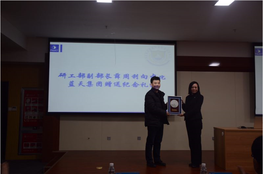校党委研工部副部长薛周利代表学校向中化蓝天集团赠送了象征深入交流合作、共同谋划发展的纪念礼物。