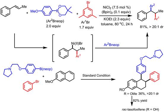 理学院张志成课题组的新讲师高品博士与印第安纳大学布鲁明顿分校的Kevin Brown课题组通过筛选过渡金属催化剂、还原剂、溶剂等反应因子,成功地利用二氯化镍实现了苯乙烯类底物的1,2-双芳基化反应,该反应利用溴苯为亲电试剂、芳基硼酸酯为亲核试剂,甲苯为反应溶剂,在80摄氏度下反应24小时。此反应底物普适性很好,各种β-取代苯乙烯都可以顺利转化,且非对映选择性比例普遍高于20:1。芳基溴苯和芳基硼酸酯的取代基无论是吸电子的酯基、三氟甲基;还是给电子的甲氧基、甲基,都能以较高收率转化成目标产物。该反应可以放大到克级,产率和非对映选择性也令人满意。另外还成功地将此策略用于消旋拉索昔芬(lasofoxifene)药物分子前驱体的合成。