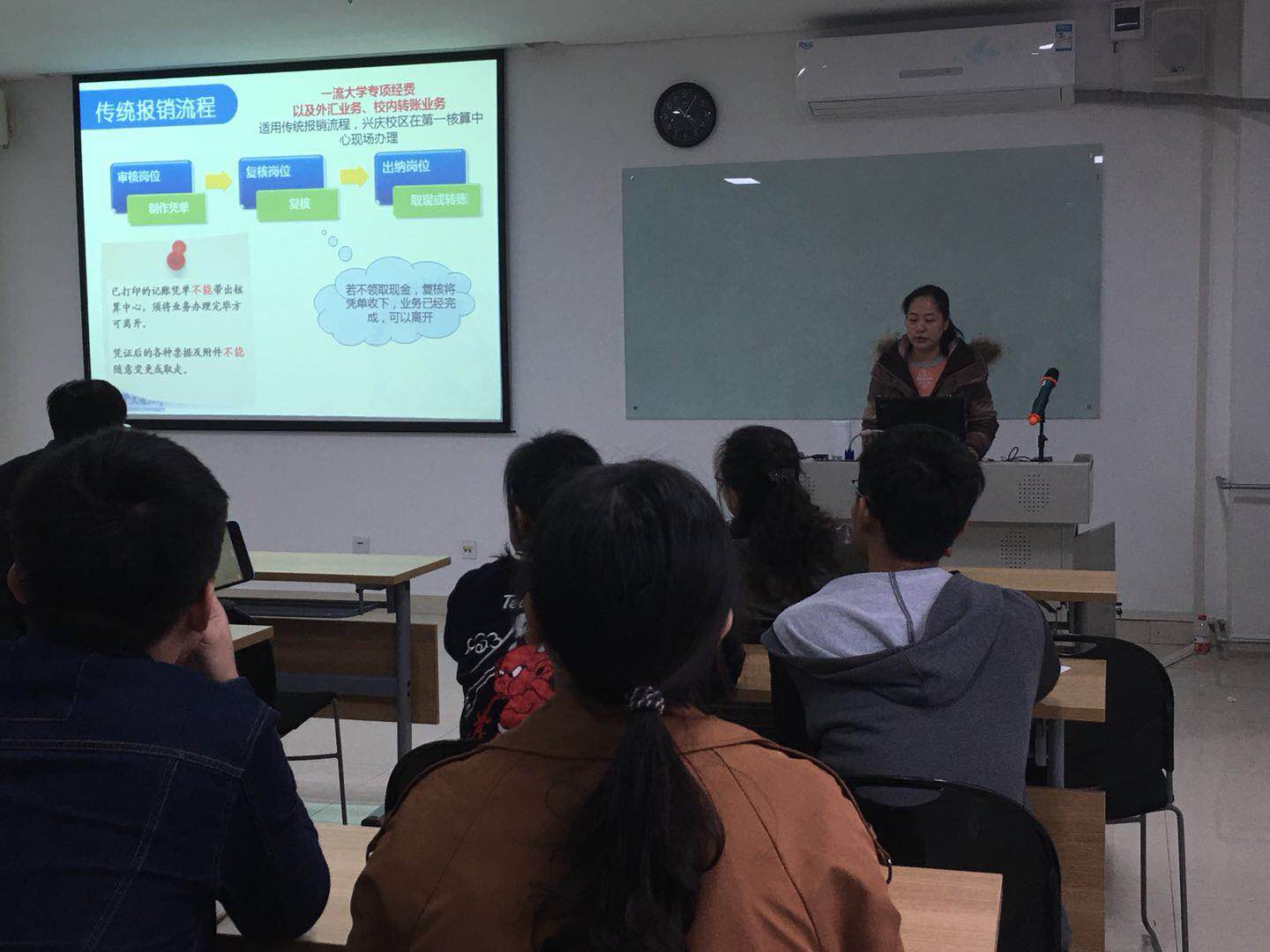 李琳主管首先介绍了学校的最新财务相关政策,并从网上报销流程、所需原始凭证基本要求、注意事项及常见业务办理流程等几个方面为大家进行详尽的讲解,就大家经常会遇到的关于会议、差旅以及科研经费报销等具体情况给予充分的解释说明。