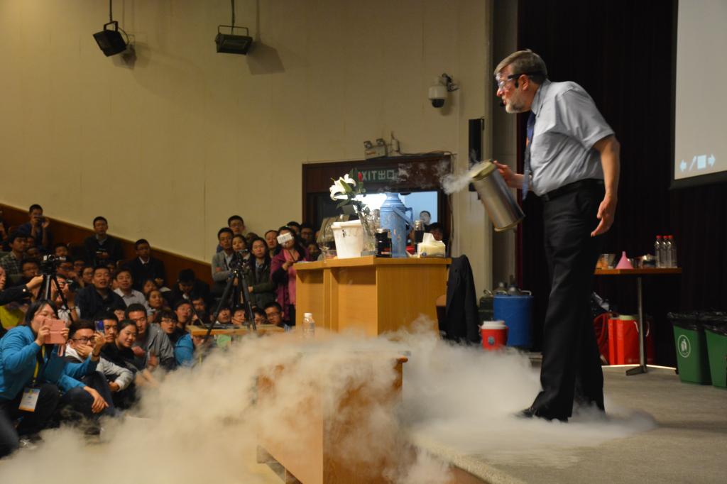William.D.Phillips教授还在现场进行科学小实验,展示液氮中气球的反应和变化,通过别开生面的小实验激发大家的科研兴趣。