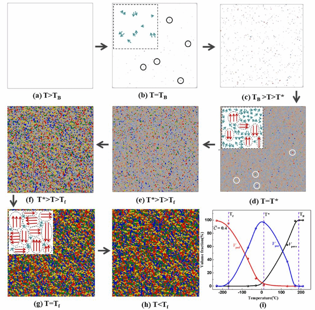图1弛豫铁电体在降温过程中微观畴结构的演化过程。当T>TB时,体系是顺电相。当T=TB时,体系中开始出现扭曲的顺电相即极性纳米区域(PNRs).当TB>T>T*时,体系中的PNR逐渐变多。当T=T*时,体系开始出现局部纳米铁电畴即极性纳米畴(PNDs),随着温度降低,体系中的PND变得越来越多。当T=Tf时,体系中的大部分位置全部变为PND。图5(i)则是降温过程中,顺电相、PNR和PND的体积分数变化图。