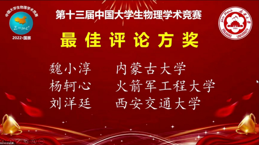 10月3日至10月6日,第十三届中国大学生物理学术竞赛(China Undergraduate Physics Tournament,简称CUPT)在新疆大学的组织下在线举行,来自全国各地64所高校的65支代表队的学子们在线开展了激烈的交流与竞争。经过3天5轮的角逐和最终的决赛阶段,伊莉影片