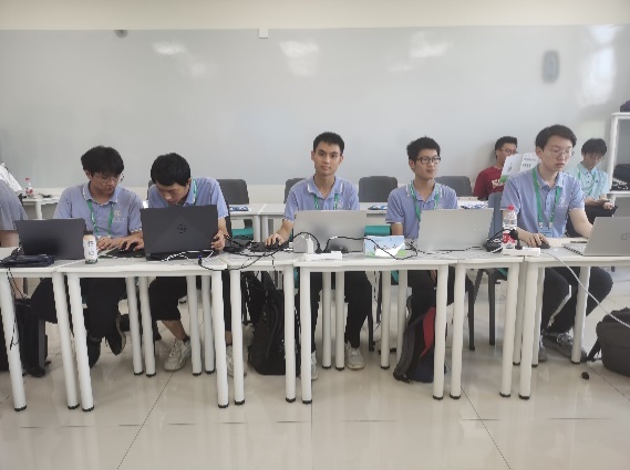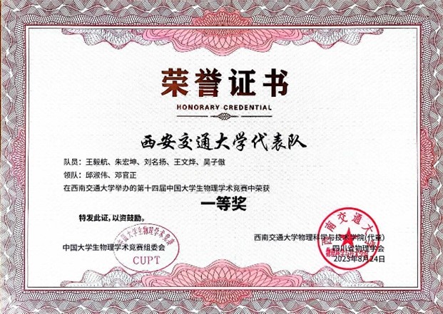由于2022年下半年疫情的影响,校内赛启动较晚、参与学生较少。虽然面临人手紧缺,时间少,任务重的窘境,同学们和指导老师们仍旧众志成城,积极备赛。为了从理论和实验及模拟仿真三方面对赛题做充分的准备,同学们放弃了周末和假期等时间,在老师们的帮助下,经过半年多的不懈努力,充分研读文献,努力完善实验,开展线下的讨论与指导。最终由王毅航、朱宏坤、邓官正、刘名扬、王文烨、吴子傲六位同学组建成队伍参加国赛。在竞赛过程中,队员们以严谨的科学态度、扎实的理论功底、巧妙的实验构思、机敏的论辩思维、默契的团队协作赢得评委专家的认可和好评,充分展示出交大学子扎实的专业基础和出众的学术风采。