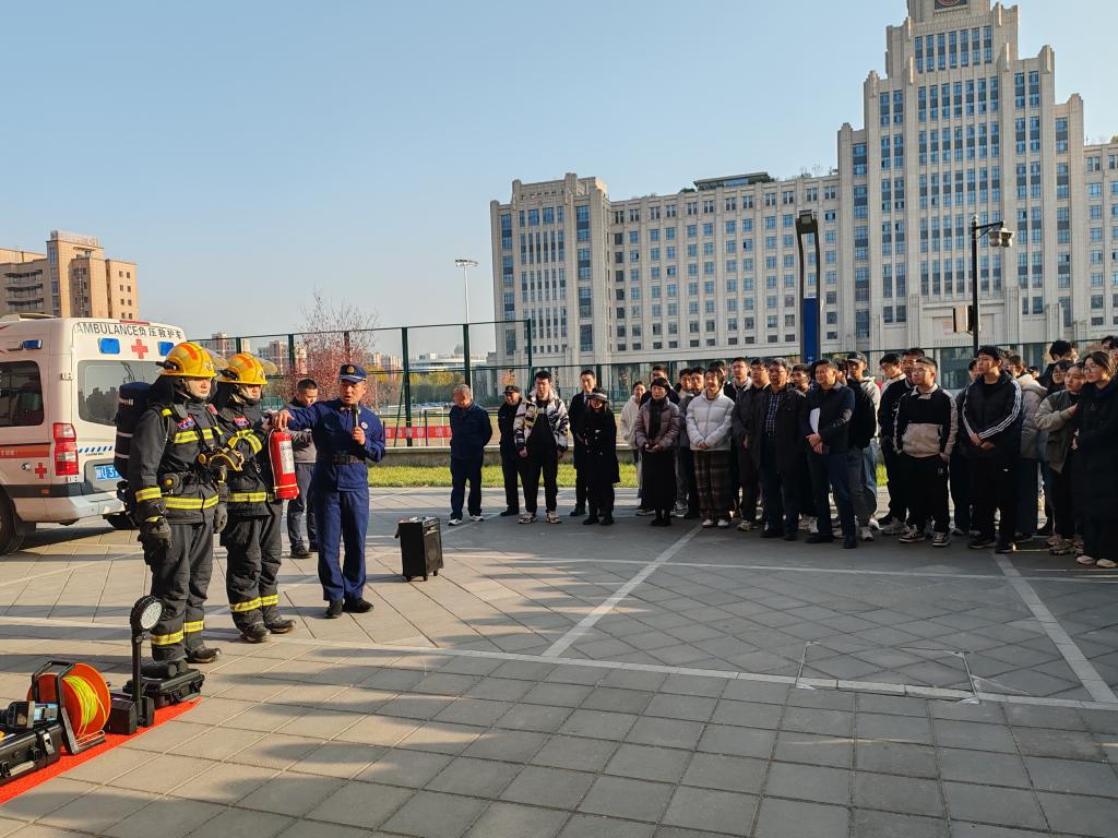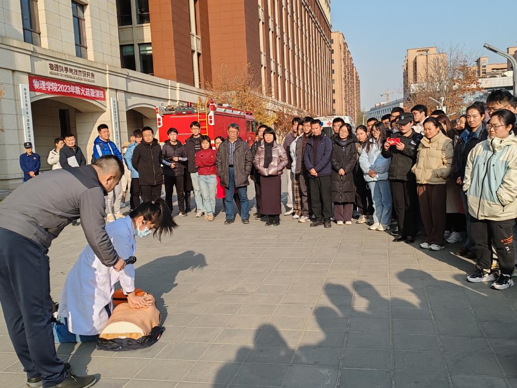 校医院急救科医生为师生现场演示心肺复苏操作流程,详细讲解了心肺复苏、除颤仪的注意事项和操作要领,给同学们普及常用的急救知识,提升应急救援能力。消防站同志们为师生分发了宣传手册与纪念品。消防救援队员现场给师生讲解了灭火器的使用步骤,随后同学们进行消防设备灭火的实操模拟。