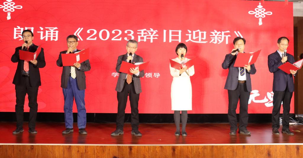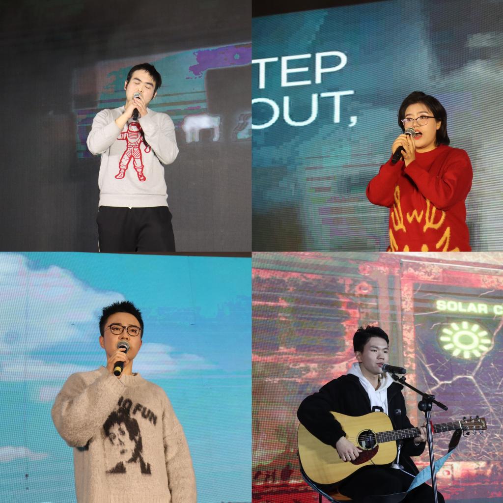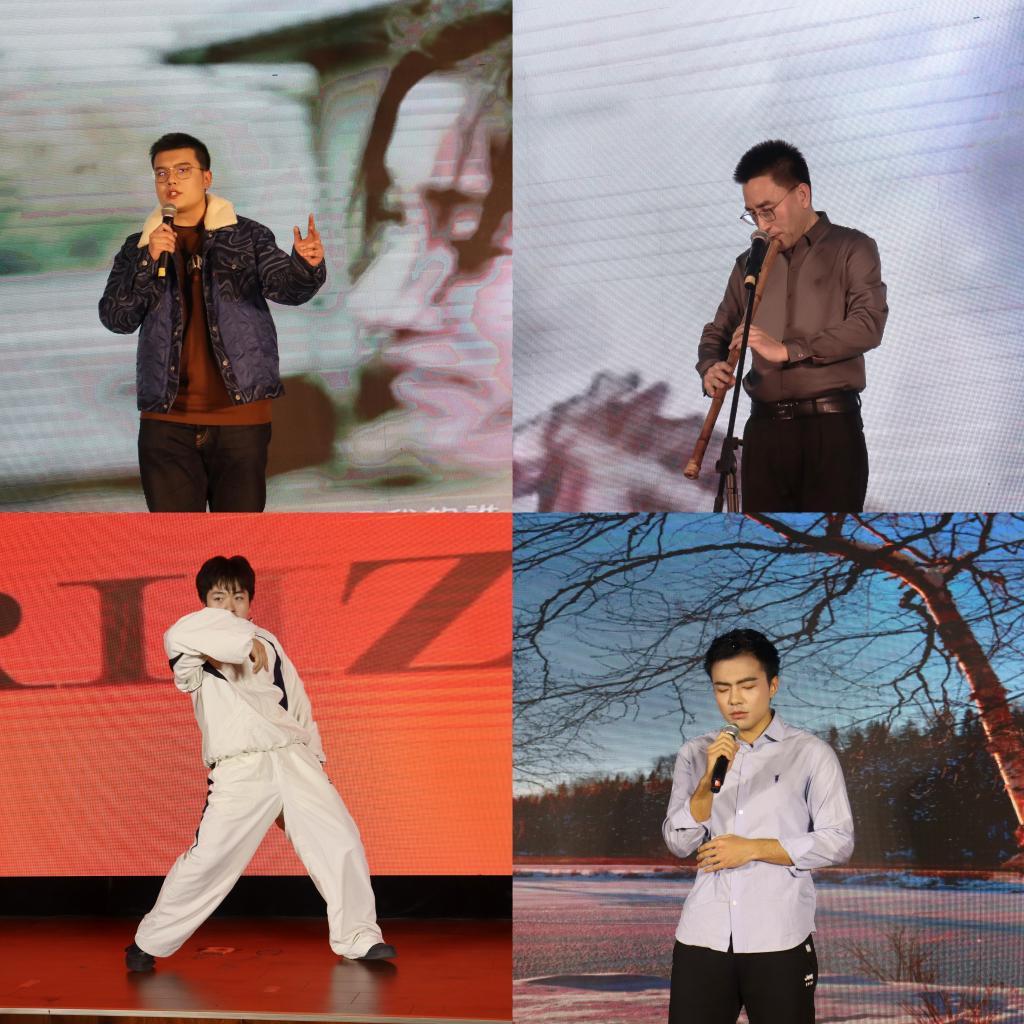 精彩的开场舞《UNFORGIVEN》拉开了迎新晚会的帷幕燃爆全场,接下来是学院党政领导朗诵《2023辞旧迎新》,回首2023年学院取得的各项成果,迎接充满无限可能的2024年。励志书院夏笑武老师演唱歌曲《七里香》极具感染力,充满浓郁的东方韵味给观众带来共鸣。由学院院办老师、研究生代表带来的诗朗诵《我们的这一年》,以诙谐幽默的方式引得大家多次大笑。白一鸣、董立桢、杨奕姝三位同学边唱边合奏《背对背拥抱》非常唯美。四首单曲《我会等》、《不要说话》、《Waving Through a Window》、《梦一场》歌曲优美动听。