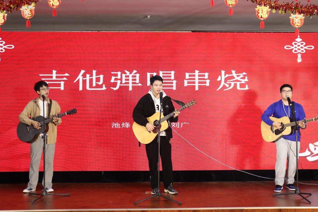 教工栗生长老师带来的萧独奏《五百年沧海桑田》,萧声清幽引发阵阵热烈的掌声。最后,由池峰、白一鸣、刘广三位同学带来《吉他弹唱串烧》,对青春的炙热进行激情的演绎,拨动的琴弦让观众感受到朝气蓬勃,将晚会的气氛推向高潮。