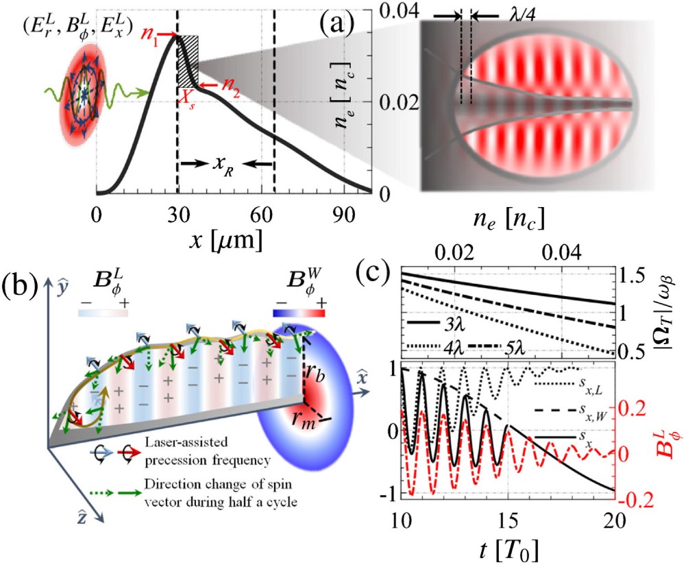 图1(a)左图:初始等离子体密度分布;右图:径向偏振激光驱动双等离子体尾波示意图。(b)激光场辅助的电子自旋进动示意图。(c)上图:电子自旋进动频率与betatron频率比值随密度的变化;下图:电子自旋分量分别在激光场(sx,L)、尾波场(sx,W)和叠加场(sx)中随时间的进动。