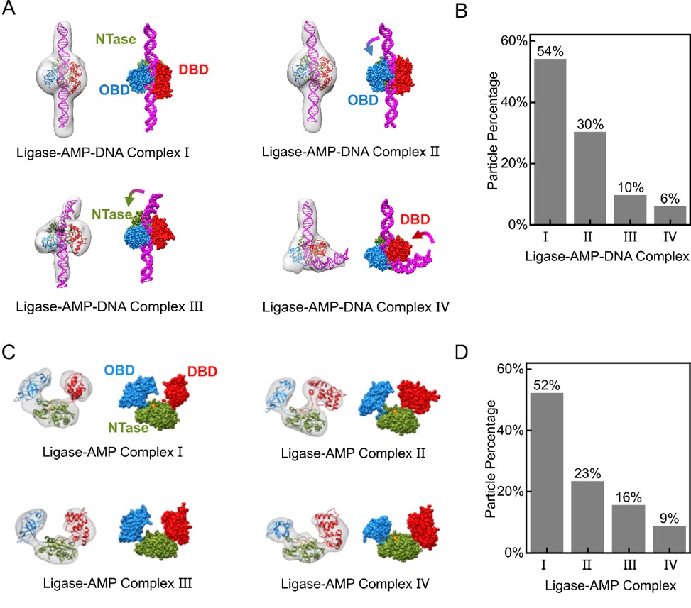 研究团队基于单颗粒电子显微镜成像与重构技术,发现T4连接酶在被AMP结合激活后呈现出四种稳定构象,且在与底物DNA进一步结合后依然保持四种构象,复合物中的DNA弯曲角度大约为0°、20°、60°或100°,显示了T4连接酶的多态催化构象。