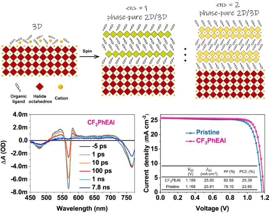 研究团队使用不同碳链长度的4-三氟甲基苯基碘化胺盐,分别原位制备了具有<n> = 1和2的RP钙钛矿层与3D钙钛矿层形成异质结构。这种疏水的2D钙钛矿层稳定了3D钙钛矿的晶体结构,促进了载流子的提取,钝化了表界面存在的缺陷,最终提升了器件的整体性能。经过DFT计算和相应的XPS测试得知,有机配体中的F、N原子与钙钛矿表面的Pb2+离子形成强有力的相互作用,使得钝化效应和电荷转移能力获得增强。研究发现,不同n值的2D钙钛矿与3D钙钛矿形成的异质结在能带匹配上略有不同,大n值的二维钙钛矿倾向于形成更有利于电荷转移的II型能带匹配关系,这为同时提升钙钛矿太阳能电池效率和稳定性奠定基础。