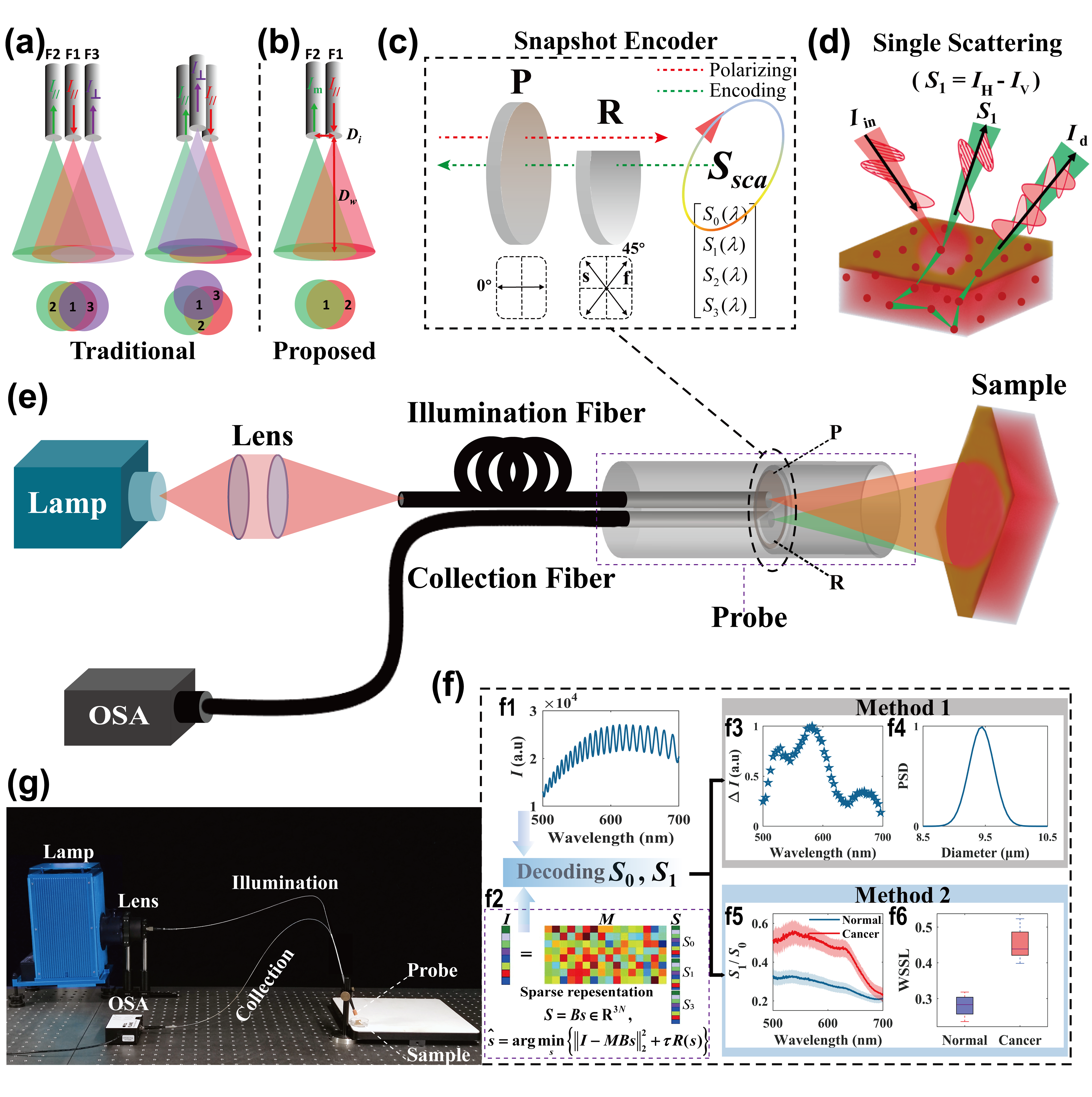在前期的研究中,合作团队首先提出了一种快照式单光路PLSS体外系统并验证了方法的可行性(Journal of Biophotonics14, e202100140, 2021,内封面论文),随后又提出了一种数据驱动的贝叶斯神经网络框架以加速早癌细胞核尺寸的反演(Optics and Lasers in Engineering160, 107298, 2023)。在前期研究基础上,本研究(Laser & Photonics Reviews, 2400486, 2024)首次推出一种新型的简洁快照式单光路PLSS内窥系统,仅由一束照明光纤光路和一束收集光纤光路组成。为在收集光路实现快照式测量,首次提出仅由单个多级延迟器和线偏振片组成的光谱调制模块,并将其集成在内窥镜的远端位置,以编码偏振散射光谱。随后,使用先验约束的压缩感知算法对调制光谱进行解码,进而从多次散射光谱中分离出单次散射光的Stokes光谱。解码后的Stokes光谱可用于迭代反演细胞核的尺寸分布,但是迭代过程比较耗时。为避免迭代问题,基于散射的Stokes光谱,我们又提出了一种新的癌症诊断指标——WSSL(Weight of single scattered light)。与传统的迭代方法相比,直接计算的WSSL省却了复杂的模型反演步骤,使得诊断更快、更准、更适用于临床环境。这一技术在一定程度上解决了传统PLSS内窥系统的问题,并为实现像素级的PLSS成像内窥镜技术带来了希望。