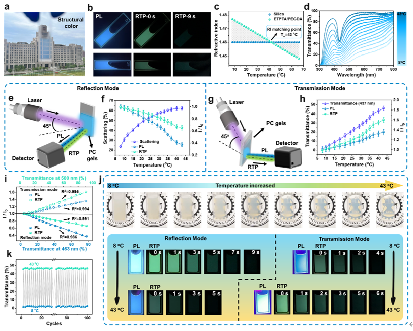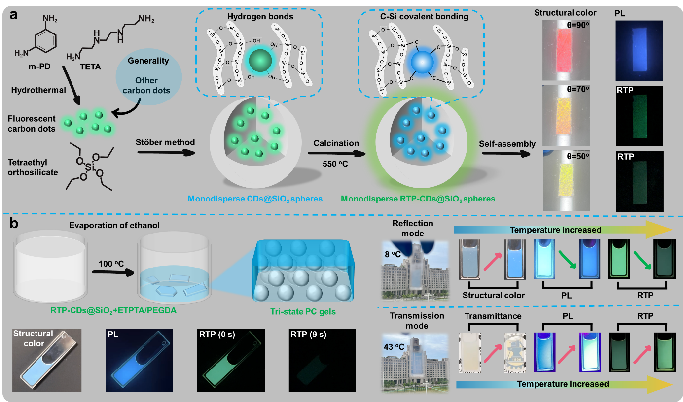 研究人员提出了一种新颖的通用性策略来制备具有三重光学形态的光子晶体(三态PCs)。通过高温煅烧内部封装有荧光碳点(CDs)的SiO2纳米颗粒,形成具有规则形貌的单分散磷光SiO2纳米球(RTP-CDs@SiO2)并自组装成三态PCs。该PCs的三种光学模式在不同光源环境刺激下可以无缝切换,即在日光下具有虹彩结构色、紫外光照射时发出明亮的PL以及关闭紫外光后产生时间依赖的RTP。研究表明,高温煅烧产生磷光的内在物理机制是由于强C-Si共价键网络的形成进而稳定了激发三重态。进一步发现,磷光不依赖于所包裹CDs的表面缺陷类型或杂原子掺杂,因此证明所提出的制备方法具有通用性。此外,研究人员在该材料的基础上进一步实现了热响应三态光子凝胶。通过简单调整凝胶的环境温度(8oC-43oC),可以巧妙地将物理发光(结构颜色和透光率)与化学发光(PL和RTP)相联立,并且这些光信号在不同光传播模式下表现出互补偿特性。最后,研究人员展示了三态光子凝胶在可回收智能窗和多维信息加密等领域的应用场景,表明该材料在未来新型光学器件设计方面的广阔的应用前景。这一工作为物理色(结构色)和化学色(PL和RTP)的有机整合和系统集成开辟了新的途径,其丰富的光学性质有助于相关材料及光学器件的设计、研究向更高水平发展。