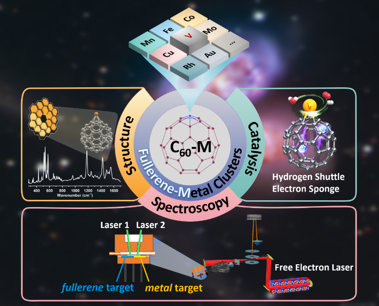富勒烯的发现引发了研究人员对其性质和应用的广泛研究兴趣。本成果首次测量了富勒烯–金属团簇的气相高分辨红外光谱,结合量化计算和分子动力学模拟,确定了钒离子在富勒烯表面的最有利结合位点为五元环上方,其稳定性起源于金属与C60之间的轨道相互作用和静电相互作用;将目前已有实验测量的所有富勒烯物种的红外光谱的特征频率汇编为VibFullerene数据集,利用量化计算结合统计分析,提出了预测富勒烯相关物种红外光谱的可靠方法,为JWST望远镜搜索这些星际物种提供参考;通过构建富勒烯–铜团簇模型,深入研究了C60修饰的Cu/SiO2催化剂催化草酸二甲酯加氢制乙二醇的微观机制,揭示了C60所起电子缓冲效应的重要性。基于以上成果,申报人以第一作者在Acc. Chem. Res.、JACS、ACS Catal.和MNRAS等国际顶级期刊发表论文7篇。
