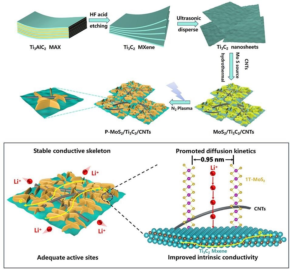 P-MoS2/Ti3C2/CNTs多级结构负极材料制备流程和储锂机理示意图