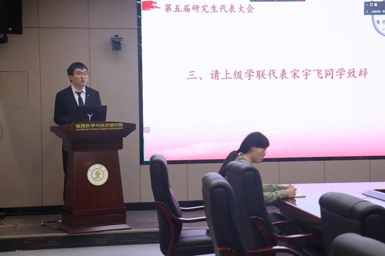 校研究生会代表宋宇飞也到场祝贺大会顺利召开,并感谢学院对研究生工作的支持。他呼吁研究生代表们加强自身建设,树立正确的理想信念,并加强沟通合作,实现资源的优化整合,更好地为同学们服务。