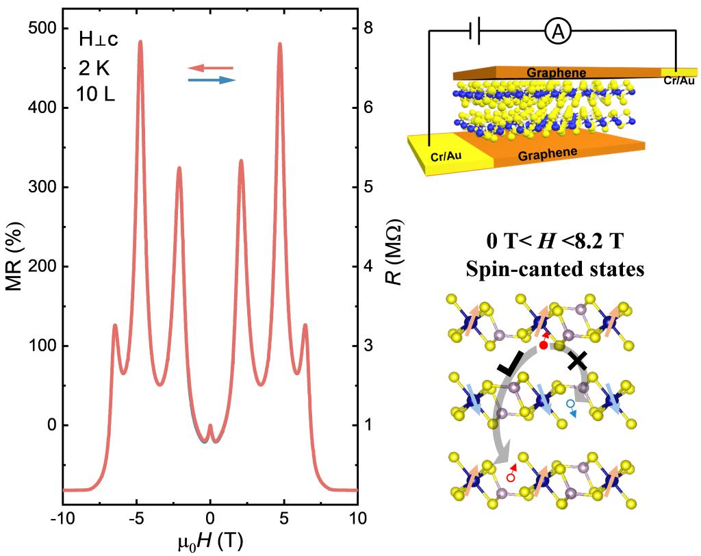 图1. (左)10层CrPS4器件2 K下的磁电阻振荡;(右上)垂直节示意图;(右下)自旋选择的层间跃迁模型示意图。
