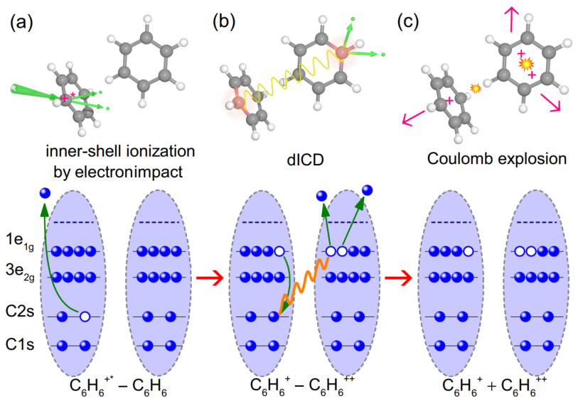 任雪光教授团队与合作者建立了电子碰撞和强场飞秒激光电离相结合的实验方案,发展生物分子团簇束源技术、多粒子符合动量成像方法,在实验上揭示了生物分子二聚体分子间双重库仑衰变机制(double intermolecular Coulombic decay, dICD,图1):以苯二聚体为例,苯二聚体中一个分子发生内壳层电离后,该分子的外价层电子填充内壳层空穴,释放的能量传递到相邻分子使其双电离,随后发生三体解离。通过对比电子碰撞和强场飞秒激光实验中多个解离通道的产率,发现dICD增强了分子开环解离产率。进一步对水合苯二聚体,吡啶二聚体和水合吡啶二聚体的实验表明,dICD诱导的增强解离是一种普遍现象。这些结果证明了虚拟光子近似理论在当前体系中的可行性,即分子间能量转移可以视为一个单光子传递过程。随着邻近分子数量的增长,dICD发生概率将进一步提升,因此在凝聚相物质中,dICD将发挥更加重要的作用。此外,相较于分子间库仑衰变(ICD)过程,dICD过程产生了更多的低能二次电子和离子自由基,能够导致更加严重的辐射损伤,这为我们解析生物辐射损伤效应提供了新的物理机制。