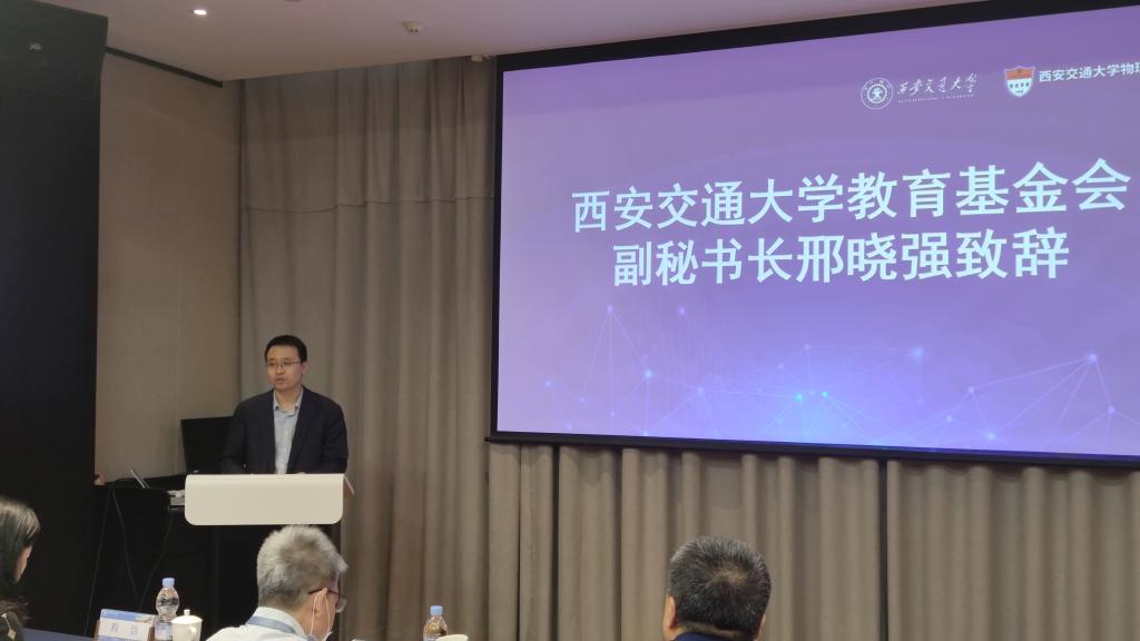 教育基金会副秘书长邢晓强致辞,他谈到此次论坛搭建了高水平校企学术交流平台,能够充分发挥校企协同育人,他鼓励交大学子无论何时何地心中要有大爱,努力为国家和社会做出贡献。